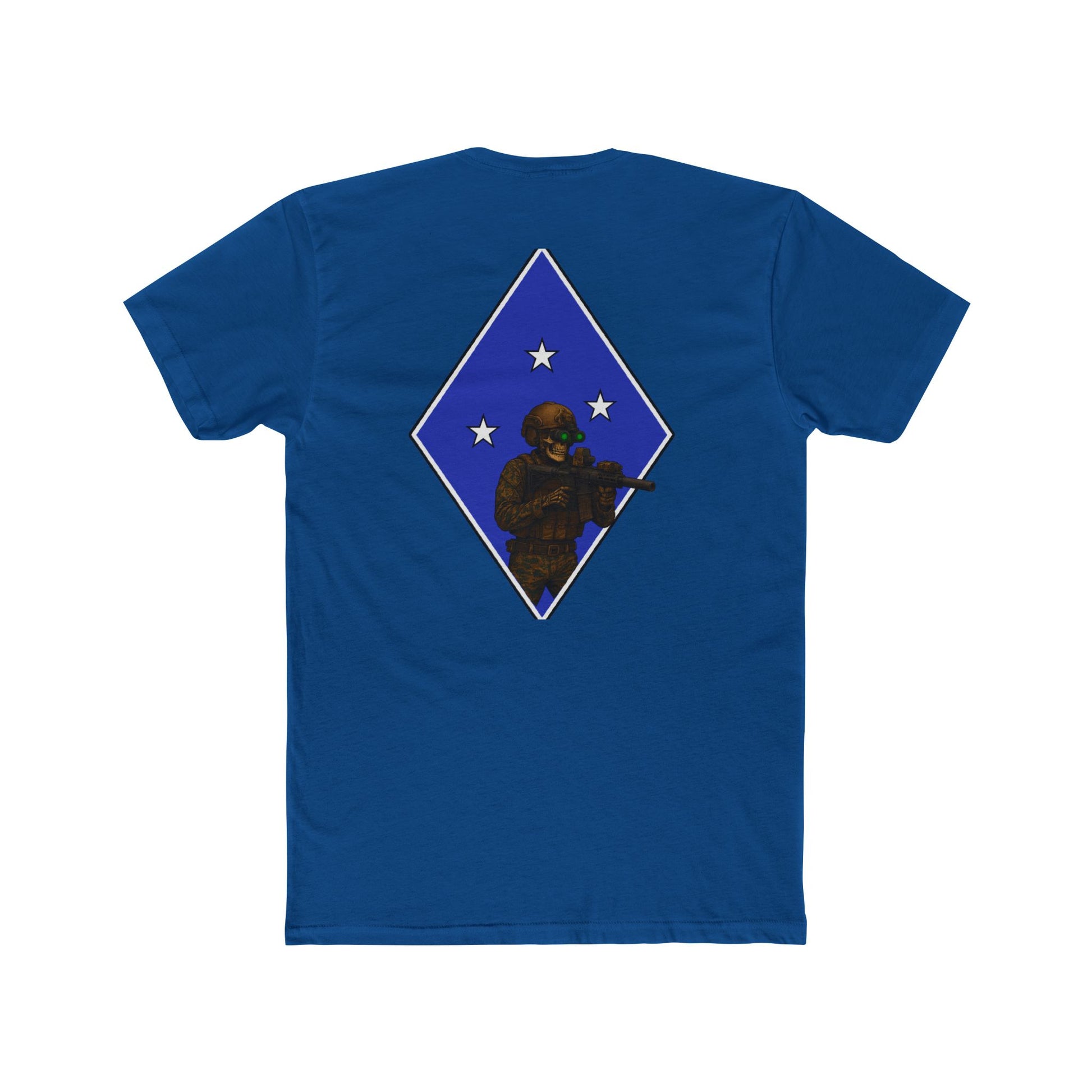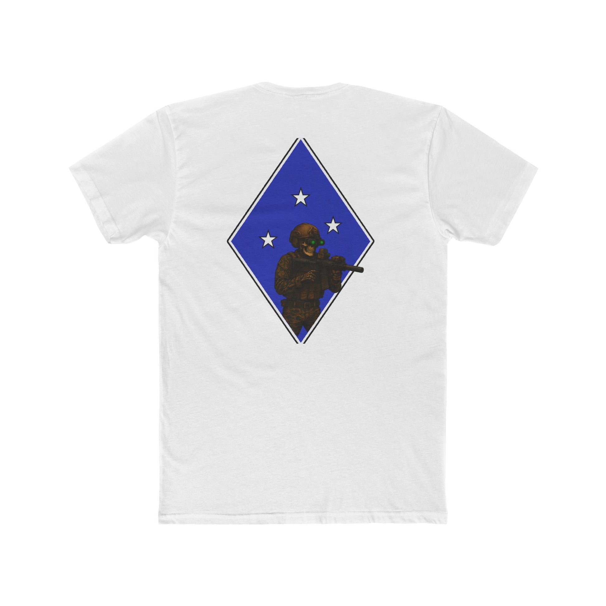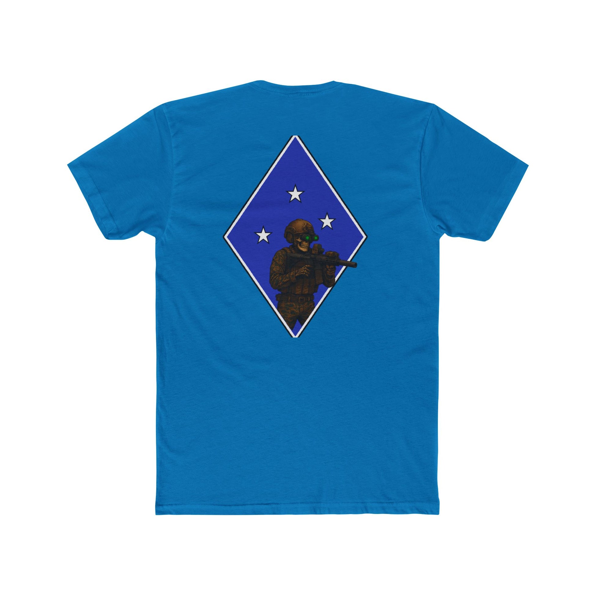 Military-inspired unisex cotton crew tee featuring a tactical skeleton blue diamond design. Gives off a cool and edgy vibe, perfect for those who love military aesthetics. Great for casual events and those who appreciate unique graphic tees. Ideal for Halloween, military appreciation events, and everyday wear.