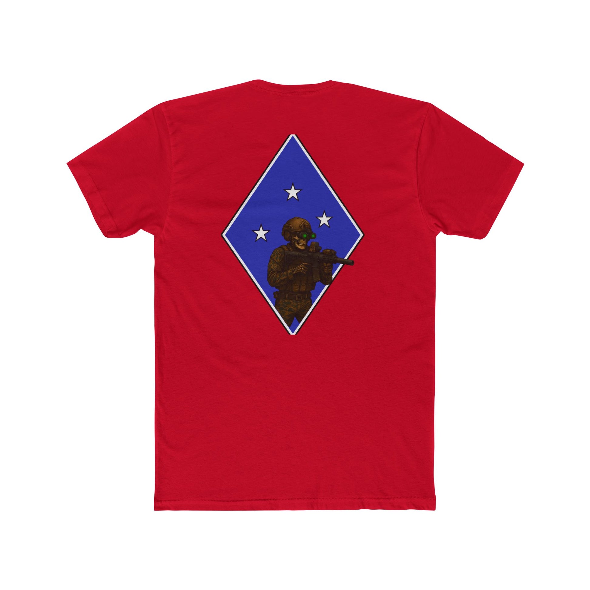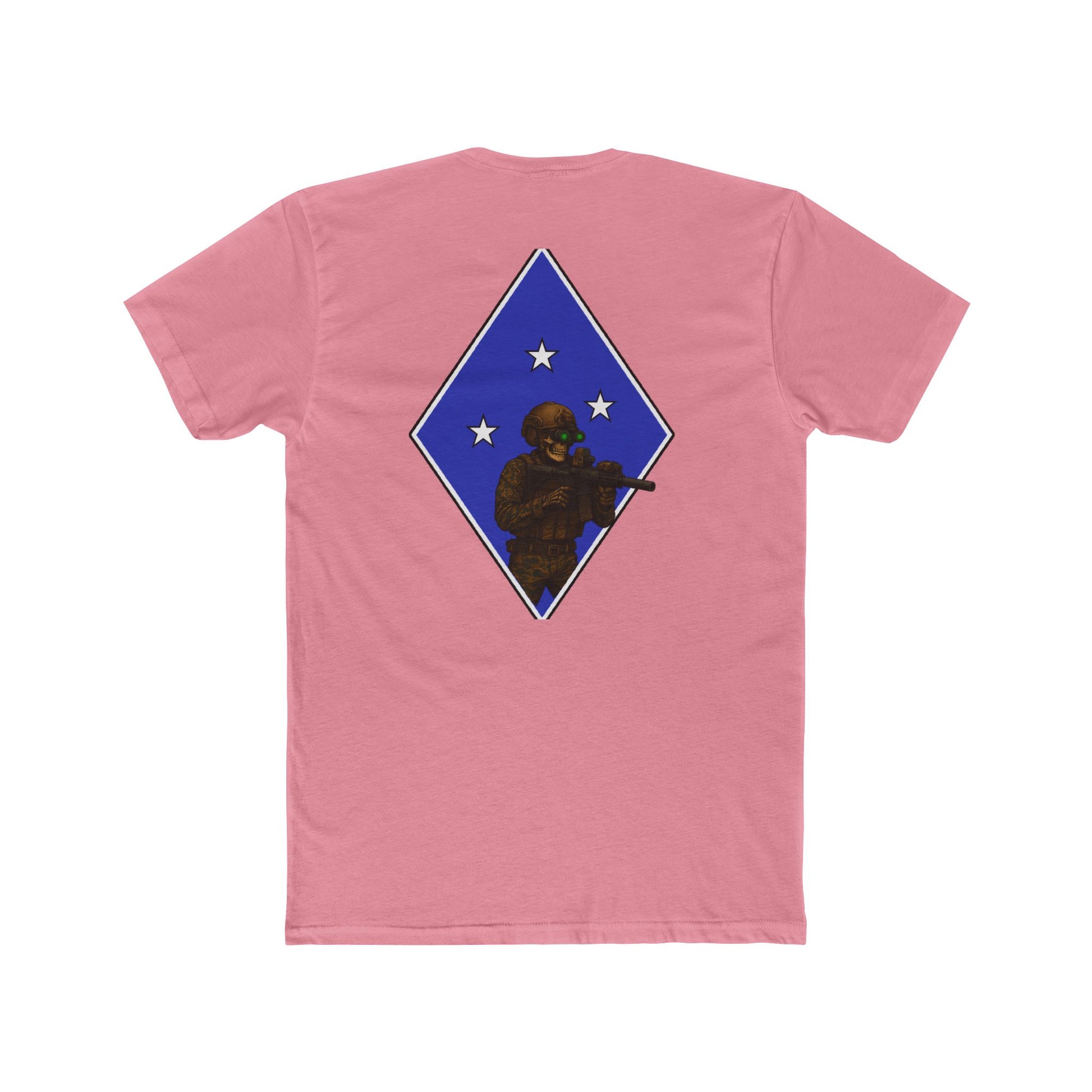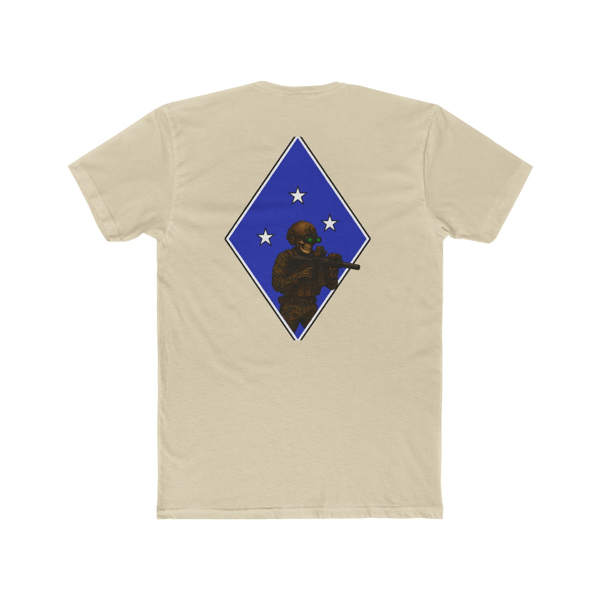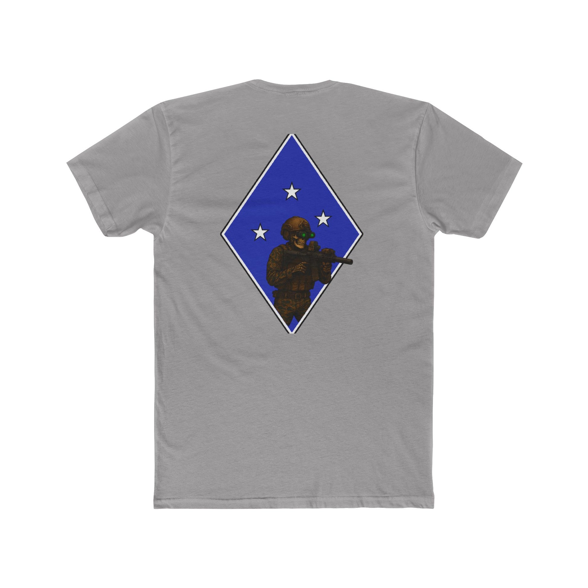 Military-inspired unisex cotton crew tee featuring a tactical skeleton blue diamond design. Gives off a cool and edgy vibe, perfect for those who love military aesthetics. Great for casual events and those who appreciate unique graphic tees. Ideal for Halloween, military appreciation events, and everyday wear.