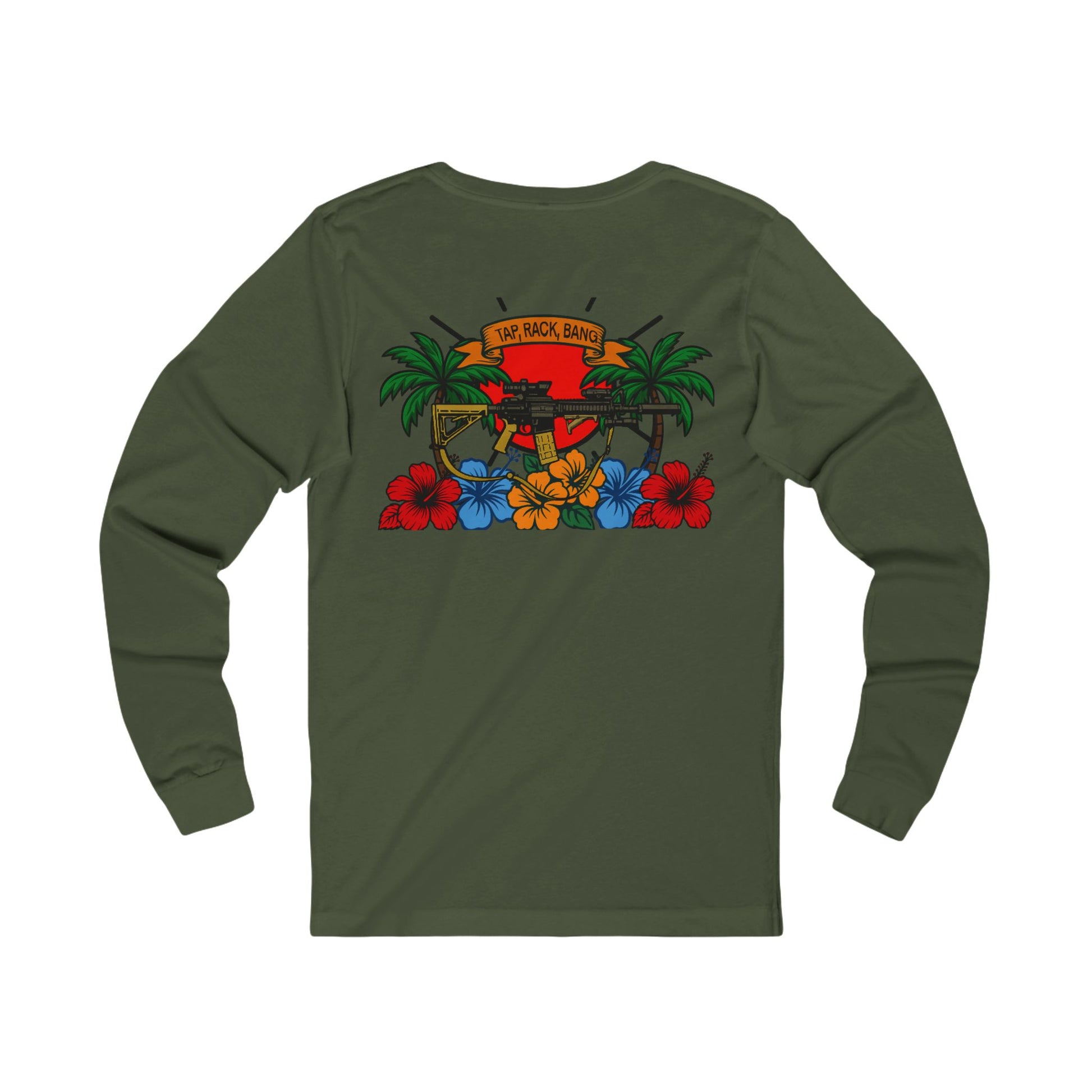 A unisex jersey long sleeve tee featuring the 'Tap, Rack, Bang' design. This tee provides a rugged and tactical vibe, perfect for gun enthusiasts and military enthusiasts. Ideal for casual wear or as a statement piece for special occasions like Veterans Day or July 4th.